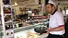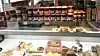 Når du kommer inn ser du kjøkken og ferskvaredisk til venstre, med pølser, skinke, ost og oljer til salgs.