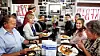 God stemning og godt besøk i hjemmekoselig lokale, med deler av kjøkkenet og innbydende ost- og kjøttvaredisk i inngangspartiet.