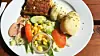 Det varierer litt fra dag til dag, men hjemmelagde kjøttkaker, lapskaus med saltkjøtt, fiskegrateng og lasagne står på menyen denne dagen.