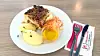 De digre gulrotskivene er for mye kokt etter vår smak. Det er de samme potetene som til fiskegratengen, men bacon og eggesmør redder helheten.