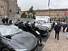 PÅ REKKE OG RAD: 007 nærmest, mens politiet flokker seg rundt Huge.