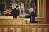 VÆRSÅGOD, TAKK SKAL DU HA: Finansminister Trygve Slagsvold Vedum (Sp) overrekker forslaget til nasjonalbudsjett for 2024 til stortingspresident Masud Gharahkhani (Ap).Foto: BENJAMIN A. WARD/STORTINGET