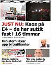 Deler av E4 var onsdag morgen stengt, og folk ble advart mot å gi seg ut på veiene. Kaoset skyldes at mange vogntog kjørte seg fast, og det er rapportert om mange ulykker, skriver Aftonbladet.