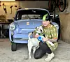 Jan-Georg Flinstad fra Oslo klemmer seg inn i en Fiat 500F, omtrent slik en velvoksen fugl på utrolig vis klarer å smette gjennom fuglekassens snevre sirkelåpning.