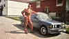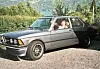 råtøff, rustrød festdress – og i bakgrunnen – hans BMW 323i 1982-modell i