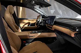 Mellom forsetene troner en høy og kraftig midtkonsoll. Dashbordet har fire horisonale luftekanaler; to under den store infotainment-skjermen (14,6 tommer), og en større i hver ytterkant. Det er også en 10,2-tommers skjerm med kjøreinformasjon bak rattet.