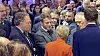 EN MESSE FOR BILEN: President Emmanuel Macron i passiar med Stellantis-sjef Carlos Tavares (med briller t.h.) og Peugeot-direktør Linda Jackson (med ryggen til).Foto: PETER RAAUM