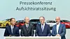 LA FRAM PLANER: VW-sjef Herbert Diess (f.v), Volkswagen AG-styreleder Hans Dieter Pötsch, VAG-styremedlem og ministerpresident i Niedersachsen Stephan Weil og fagforeningslederen Bernd Osterloh på en pressekonferanse fredag. Foto: Volkswagen AG