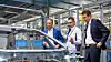 EN LITEN SJEKK: Volkswagens toppsjef Herbert Diess (t.v.) får en innføring i ID.3-produksjonen ved VWs nye elbilfabrikk i Zwickau av to av sine medarbeidere. Foto: Volkswagen AG