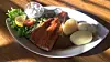 Ørretfileten er pent lagt opp på pent servise. Det er en stor og fin filet selv om den er litt vel mye stekt. Masse hjemmelaget agurksalat kunne ha hatt godt av litt mer syre. Potetene er kokt ferdig på forhånd, og de har ikke klart å holde dem varme. Rømmen serveres i et beger ved siden av.