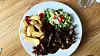 Kjøttet er mørt og fint og skåret i små biter som biffsnadder. Det er stekt med masse pepper, kantarell, løk, purre og paprika. Bakte urtepoteter er en god erstatning for pommes frites, men er de bare bakt i ovn, eller har de hatt en runde i frityren?