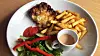 Det er litt frisk salat ved siden av lasagnen, og Thousand Island-dressingen er servert i en liten kopp så du kan velge om du vil ha den på salaten eller ikke.