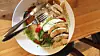 Vi spiste også kyllingsalat med lunede grønnsaker, på italiensk landbrød. Som det ikke var – landbrød altså. OK kylling, veldig gode grønnsaker, god aioli, men trist pesto. Så alt i alt, ujevnt.