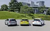 ELEKTRIFISERTE: De to Golfene til høyre er de to ladbare versjonene (den hvite er den sterkeste, GTE), mens inngangsmodellen med 110 hester har fått doble sett eksospotter.Foto; VOLKSWAGEN AG