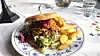 Har du lyst på noe annet enn kjøtt har de stekt laks og en toast med ost og skinke.