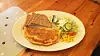 Etter mange veikrobesøk har vi skjønt at til og med det å lage en omelett, kan by på store kvalitetsforskjeller. Denne er pent stekt, om enn litt mye. En omelett er best når den er litt saftig. Og det er første gang vi har bestilt en omelett uten at vi vet noe om tilbehøret, eller at vi får velge selv. Det viser seg at den er fylt med ost og skinke og kommer med litt salat og et par brødskiver ved siden av.