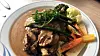 Det er tre gode skiver kjøtt på toppen av fløtegratinerte poteter som er gode og varme. Grønnsakene er kanskje litt kjedelige, en bukett blomkål, en bukett brokkoli, et par skiver neper og en gulrotbit, men de er i hvert fall ikke kokt i hjel.