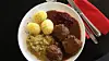 Kjøttkakene er veldig gode. Ertepureen er ikke hjemmelaget, potetene kommer med det evinnelige vonde persilledrysset. Pluss for tyttebær. God frisk cæsarsalat, ekte parmesan.