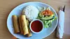 Sprø og gode vårruller med kjedelig tilbehør som smakløs ris og litt salat til pynt. Søt chilisaus fra flaske.