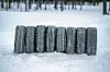 KLARE TIL TEST: De åtte piggfrie i testen, fra venstre Goodyear, Continental, Kumho, Bridgestone, Mazzini, Falken, Nokian og Michelin.Foto: FREDRIK DIITS WIKSTRÖM