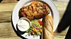 HJEMMELAGET: Lasagne med salat og én tomatskive og en fantastisk hjemmelaget, tyrkisk yoghurt.