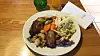 Kyllingen er saftig og overraskende godt krydret. Poteter og grønnsaker bærer litt preg av å stå under varmelamper. Flere typer salatblandinger, men den kokte skinken i risen er litt sur og har kanskje gått ut på dato?